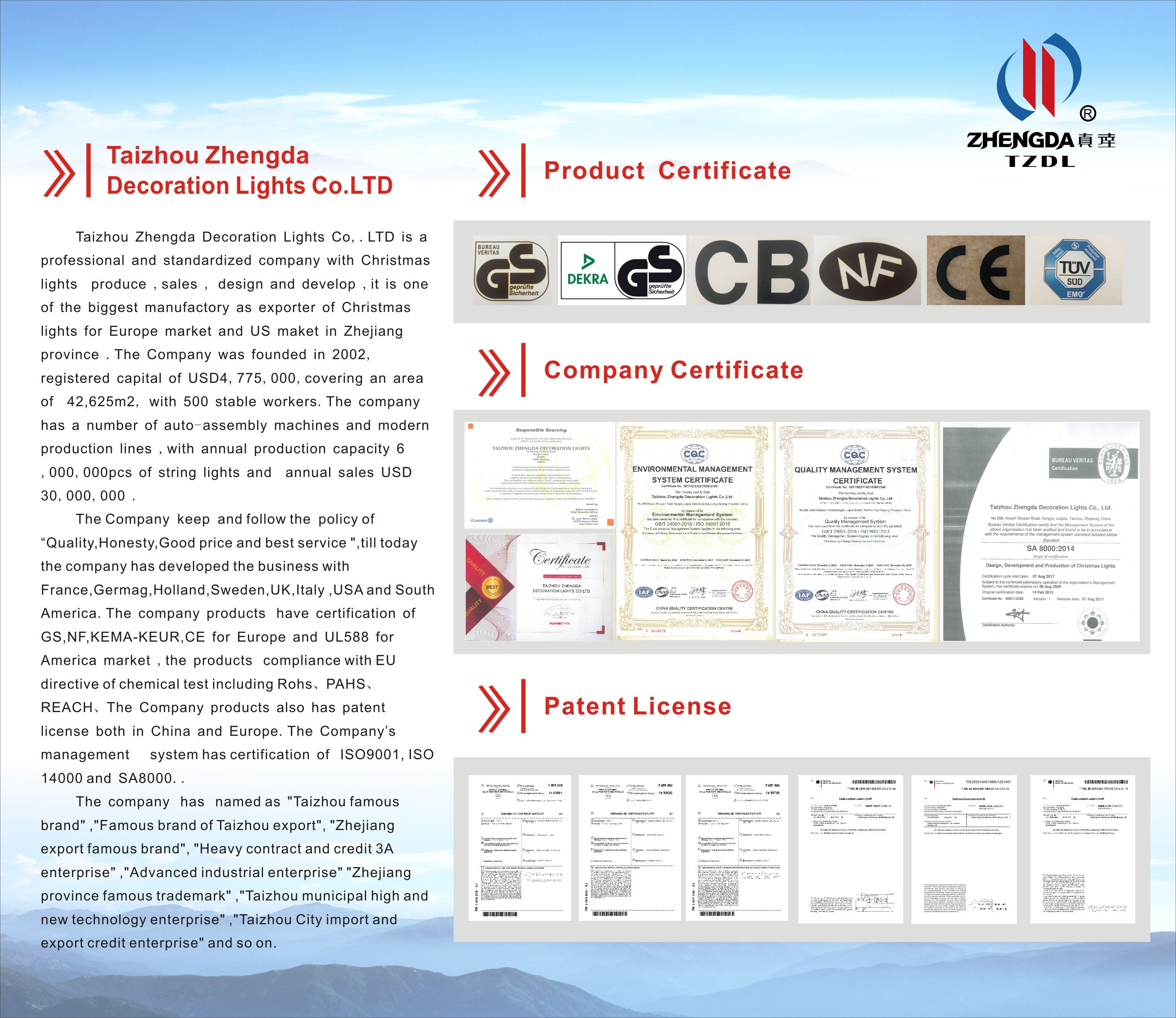 公司自成立以來,堅(jiān)持以產(chǎn)品質(zhì)量第一、安全第一為理念,大力發(fā)展標(biāo)準(zhǔn)化產(chǎn)品的業(yè)務(wù),堅(jiān)持和大力發(fā)展圣誕產(chǎn)品的設(shè)計(jì)開發(fā)、制造、銷售的綜合實(shí)力。目前業(yè)務(wù)范圍已涉及到德國、法國、荷蘭、英國、瑞士、意大利等國家;產(chǎn)品和部件已通過GS、NF、KEMA、ITS、TUV。l 同時(shí)造就了一支強(qiáng)有力的,由總經(jīng)理為核心的,以企業(yè)的技術(shù)中心為產(chǎn)品開發(fā)組成的技術(shù)團(tuán)隊(duì)和業(yè)務(wù)部組成的銷售團(tuán)隊(duì)及生產(chǎn)、計(jì)劃、QC部門組成的產(chǎn)品制造和質(zhì)量保證隊(duì)伍。 、VDE、等國家的安規(guī)標(biāo)準(zhǔn)認(rèn)證和EMC認(rèn)證以及符合REACH法規(guī)、ROHS、PAHS、6P等環(huán)保指令要求。并已通過ISO9001:2008質(zhì)量管理體系認(rèn)證和ISO14000環(huán)境管理體系認(rèn)證及QC080000認(rèn)證及BSCI社會(huì)責(zé)任體系認(rèn)證
